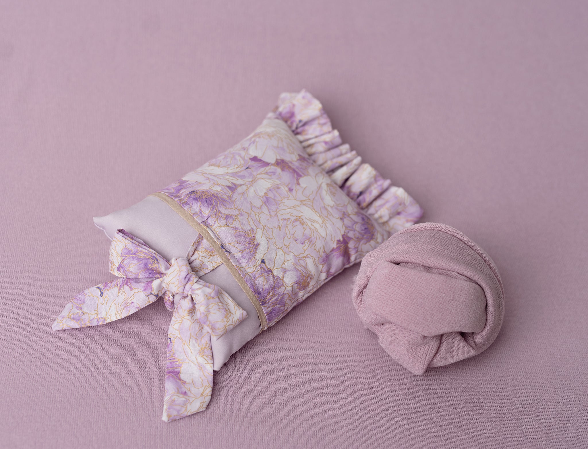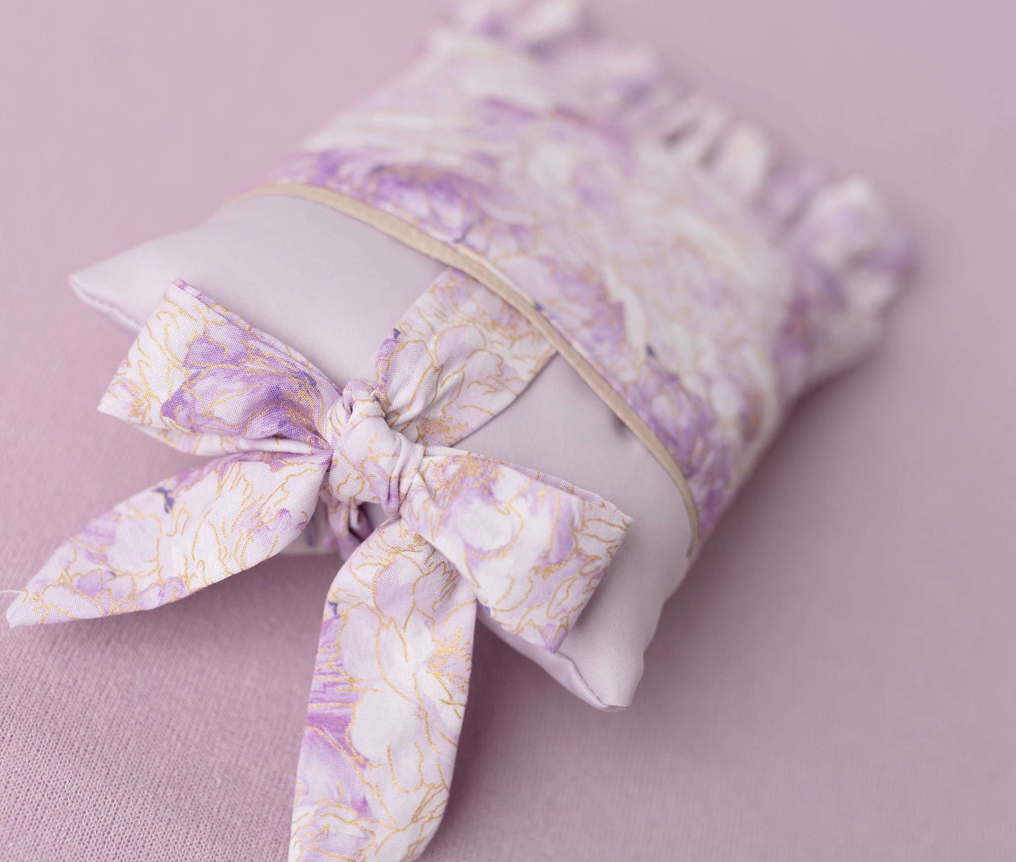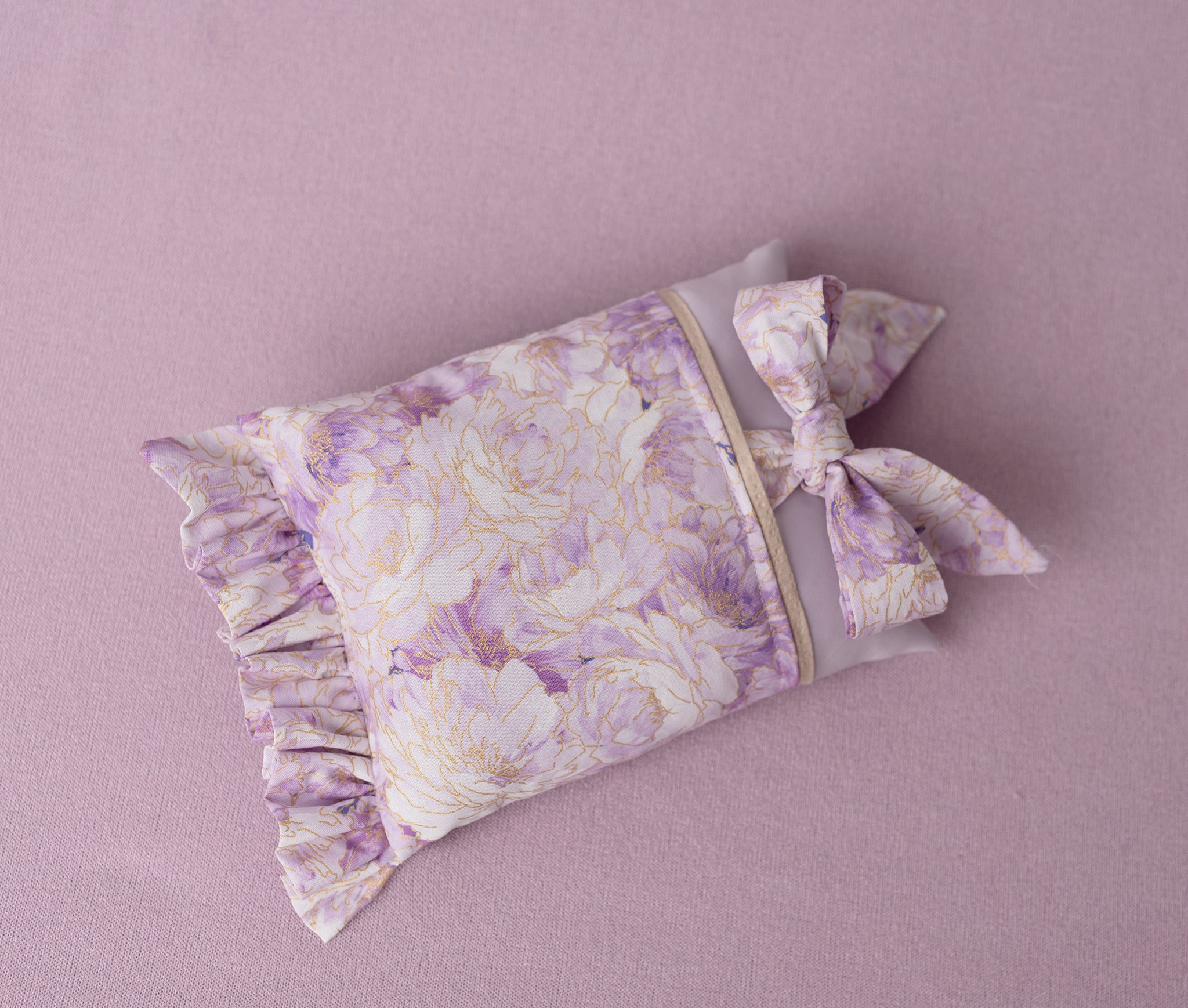 Lilac floral pillow size is approximately 6.5 x10 inches. Embellished with a ruffle on one side and a pretty bow on the other side.