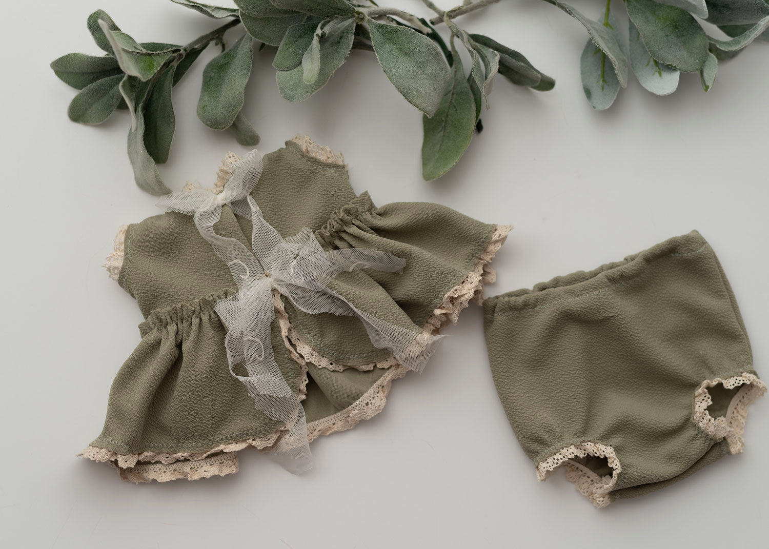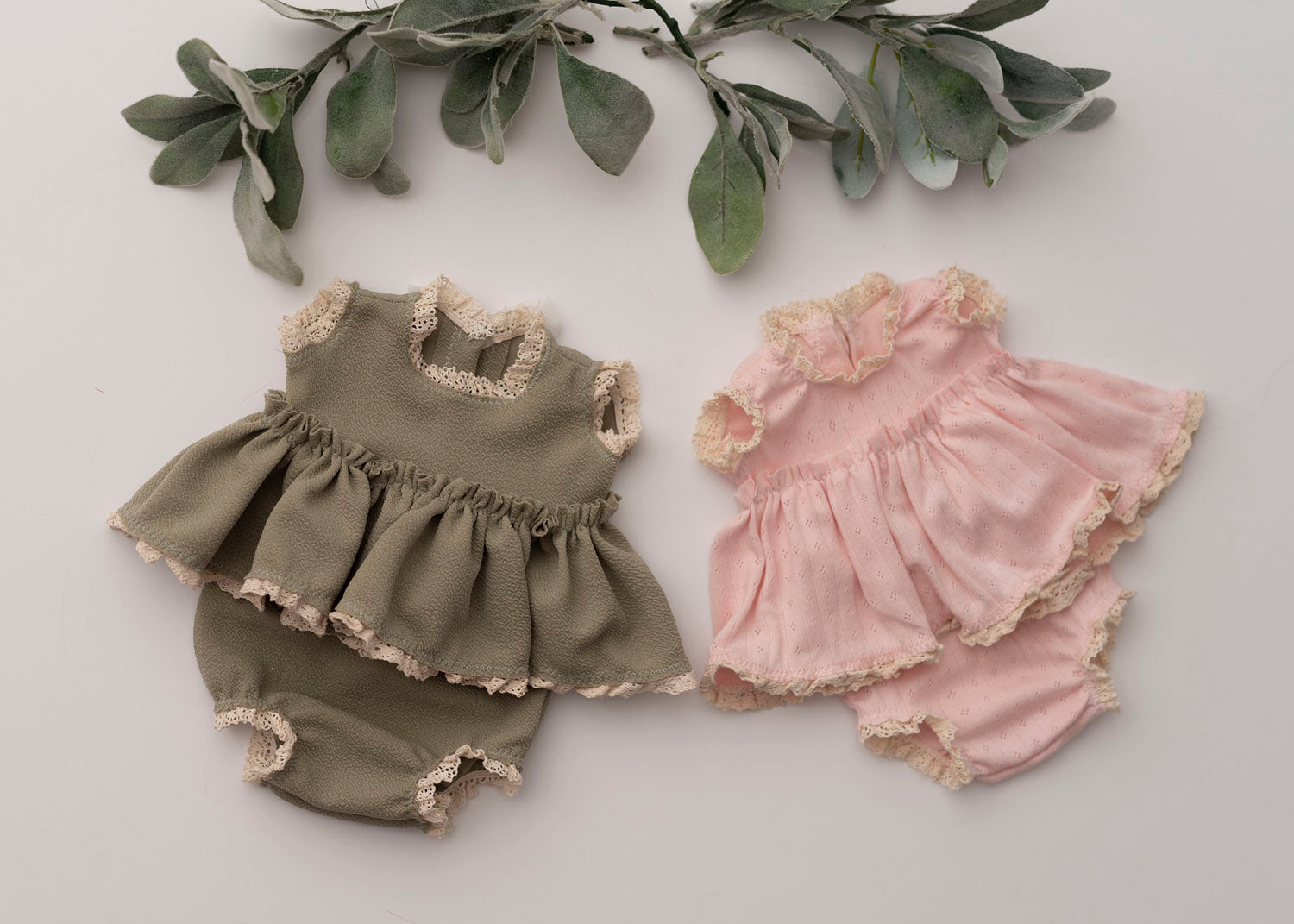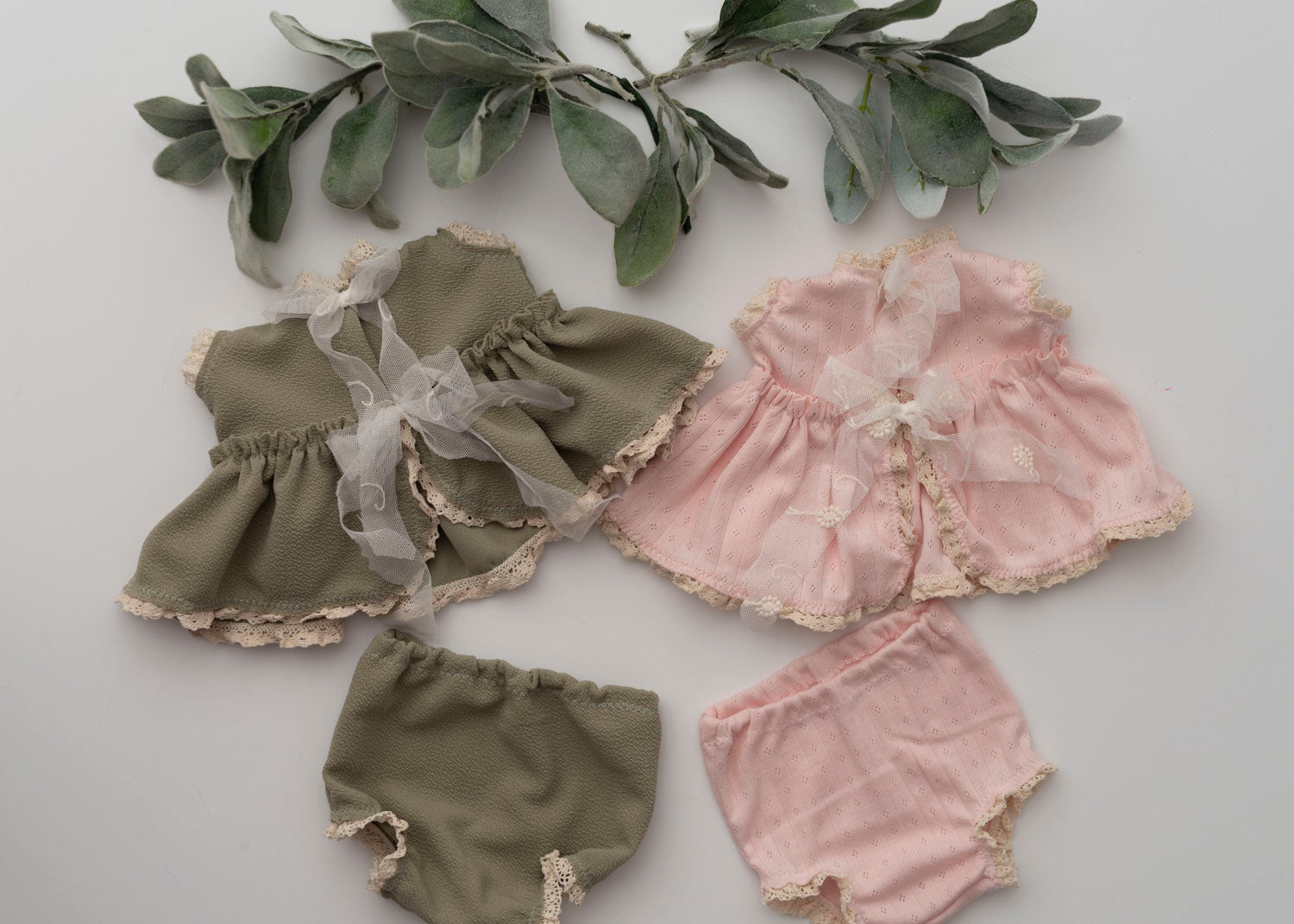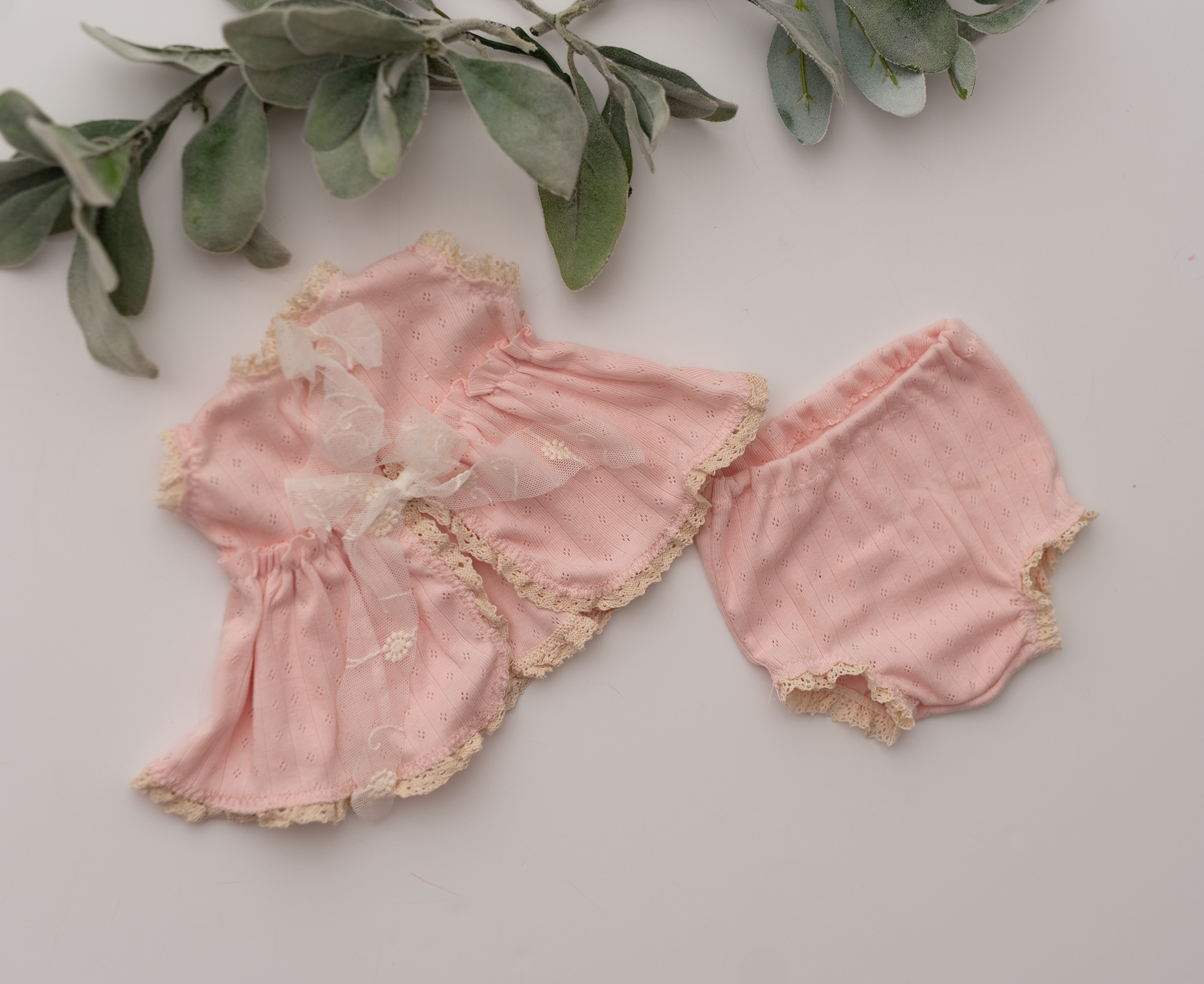 Gina pink outfit. Made with soft and stretchy fabric. Embellished with a cotton beige trim. Include top and bloomers.