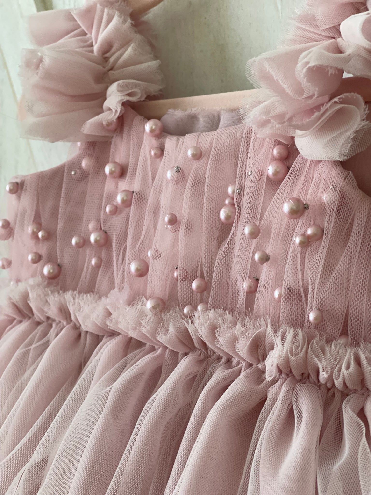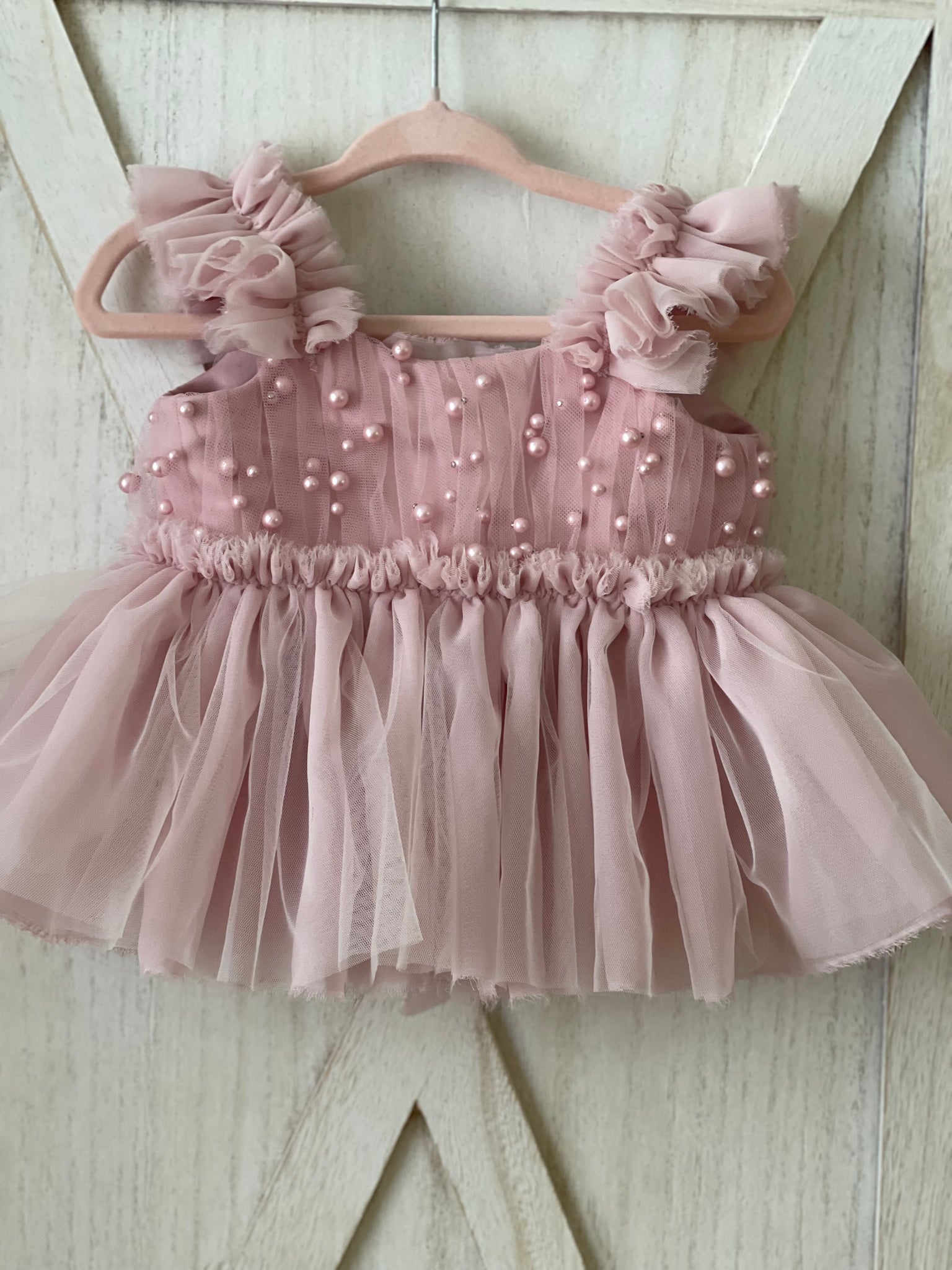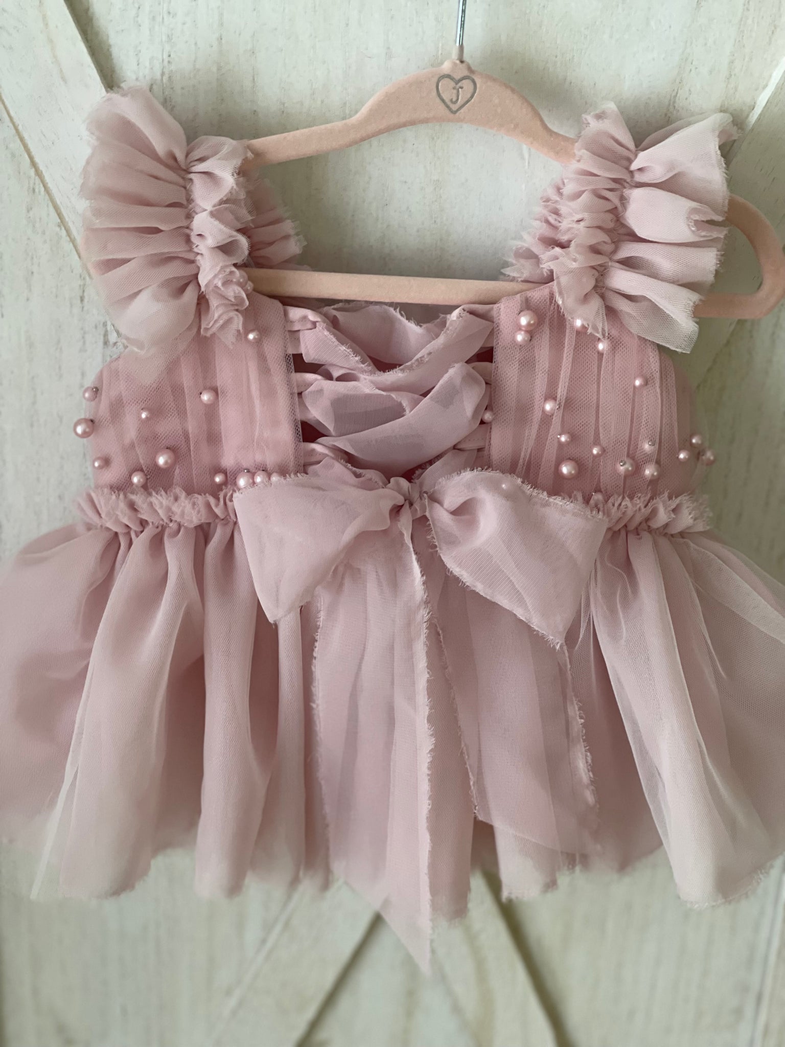 Margot outfit. Made with soft wedding tulle in a beautiful dusty-mauve rose. Embellished top with pearls and ruffles straps and a puffy ruffle skirt.